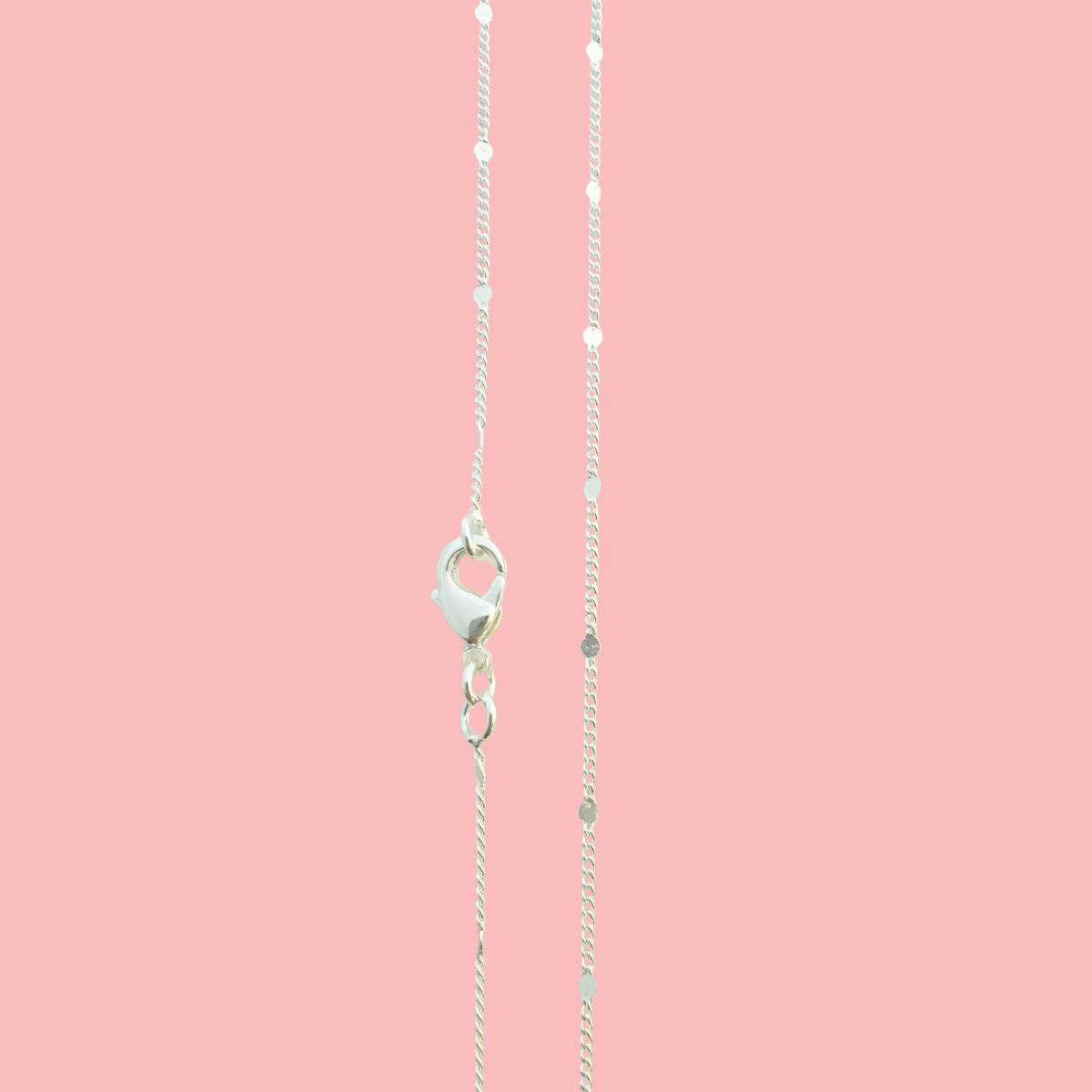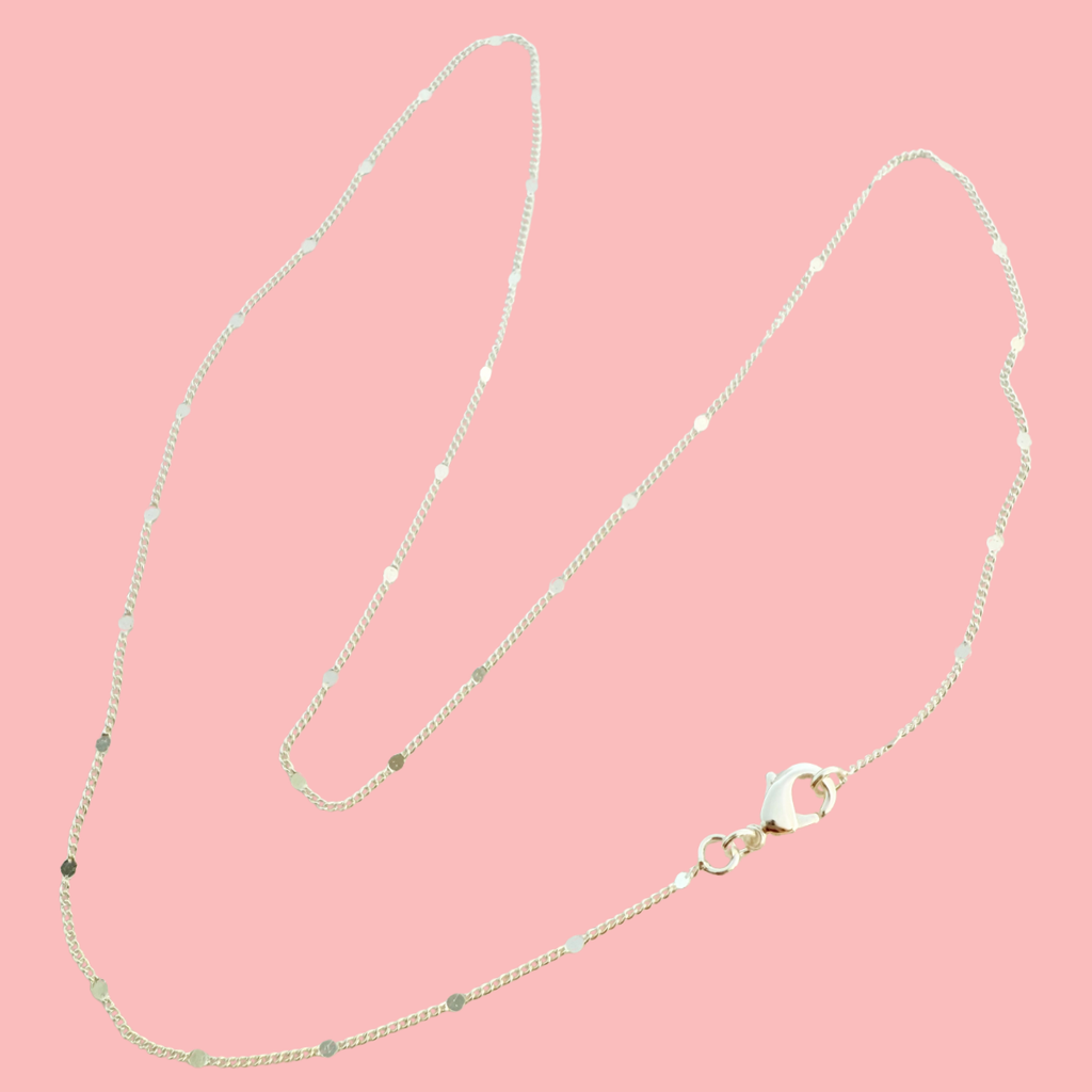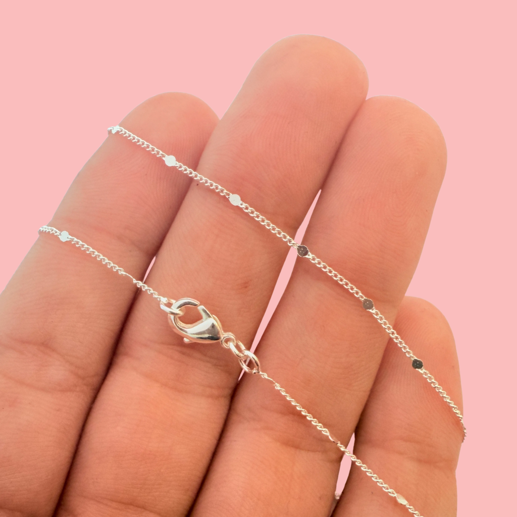 This delicate flat satellite chain is the perfect foundation for your jewellery designs. Crafted with fine 1mm silver-plated links and evenly spaced flat beads, it catches the light beautifully, giving your creations a refined sparkle.