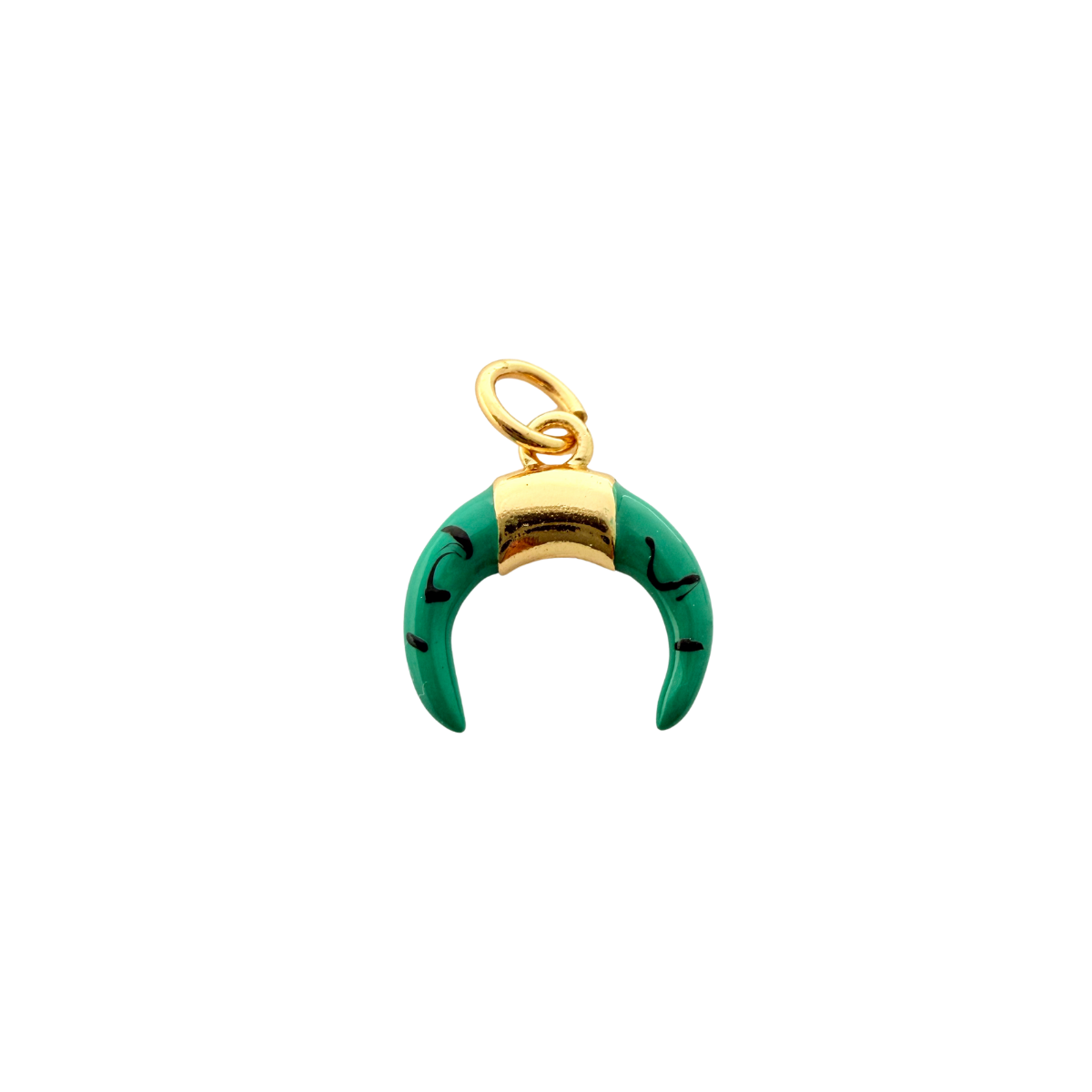 Bold yet petite, this crescent horn charm features a rich green enamel finish with subtle black detailing, capped in polished gold plating for a striking contrast. The smooth curved shape gives it a modern, talisman-inspired feel, while the gold-plated top and loop add warmth and refinement.