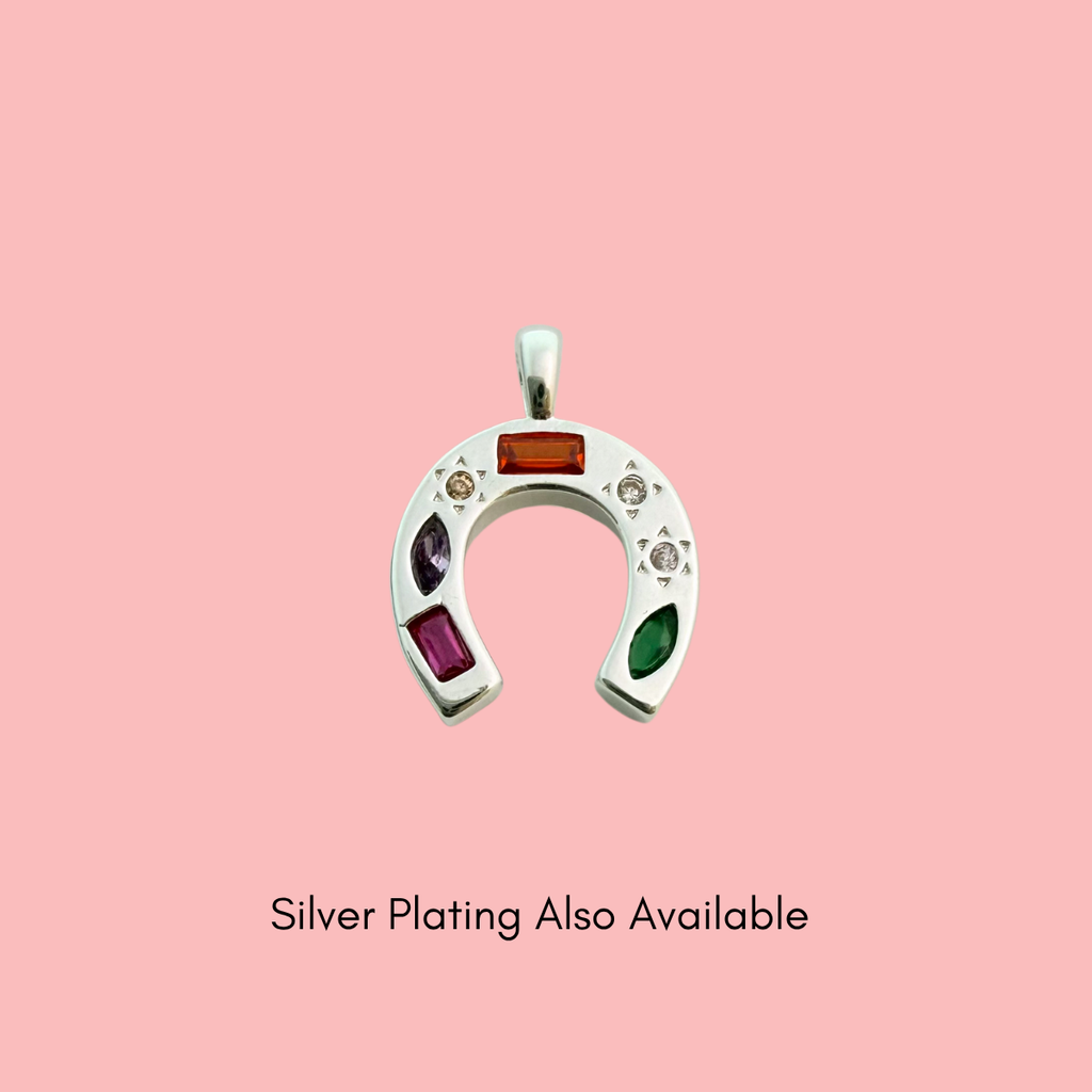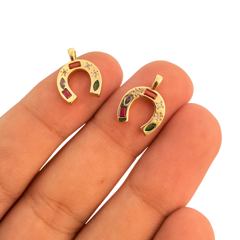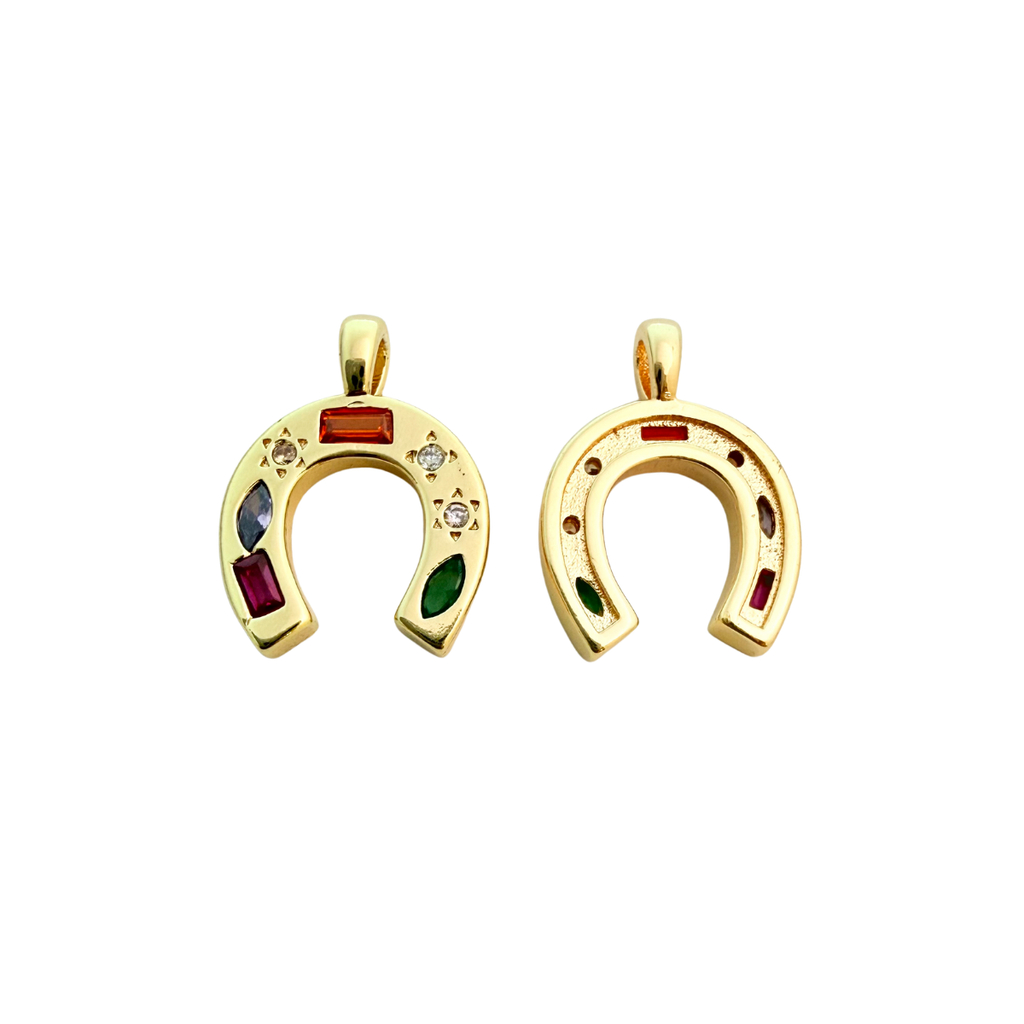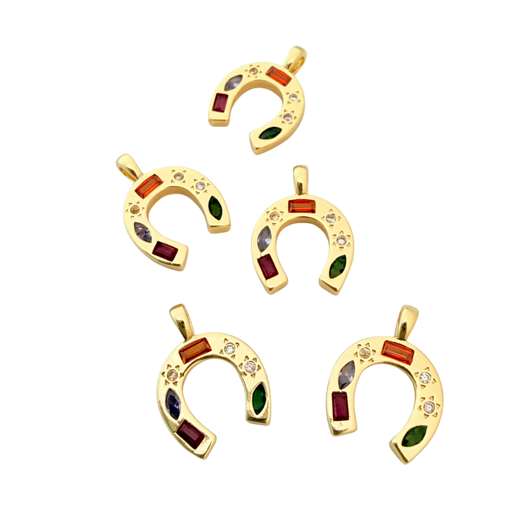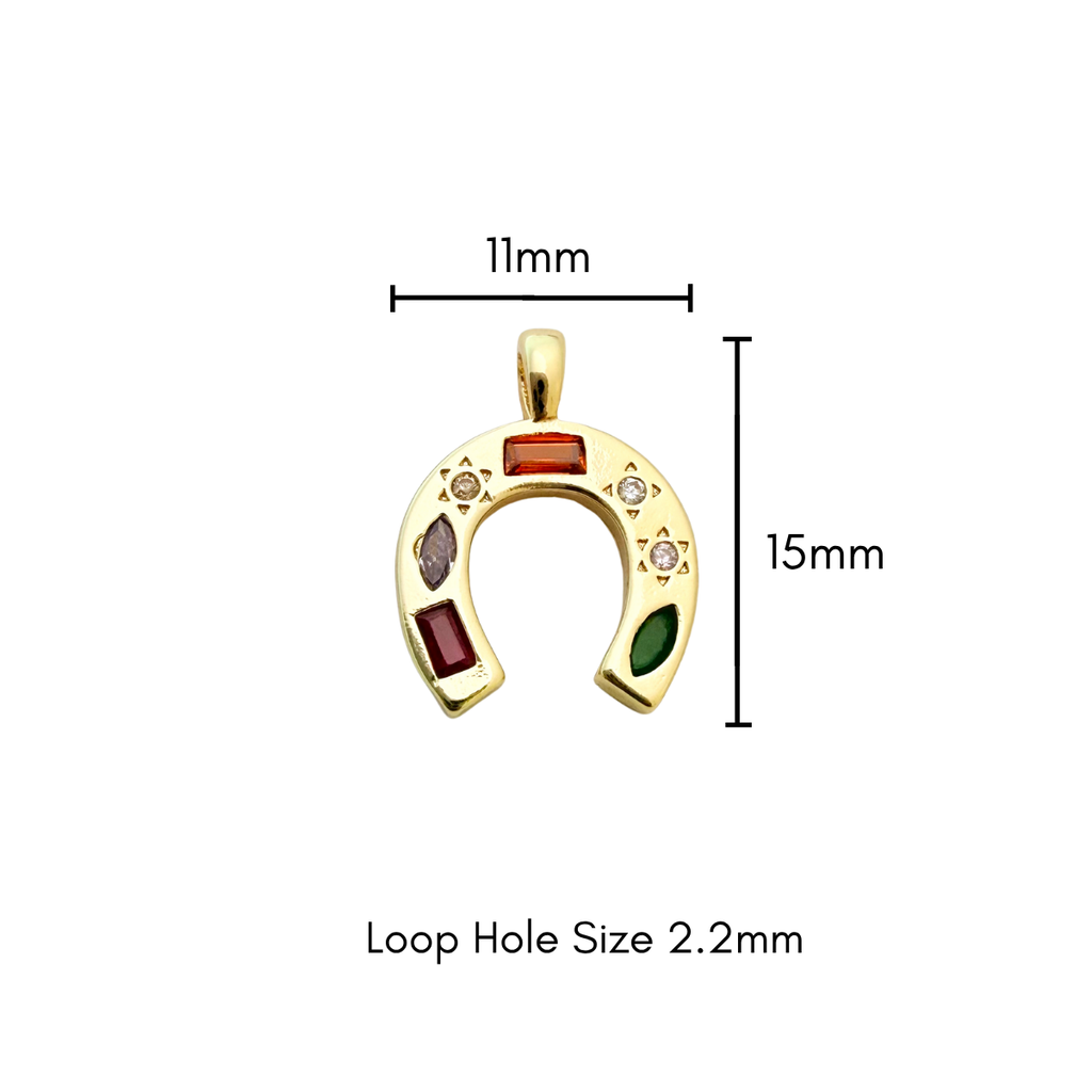 Bring charm and colour to your designs with this radiant gold-plated horseshoe pendant, a timeless symbol of luck and protection. Adorned with multi-shaped, vibrant cubic zirconia gemstones, it catches the light beautifully from every angle. The warm gold plating with a tarnish-resistant finish adds a touch of luxury, making it a meaningful focal piece for unique, lucky-inspired jewellery creations.