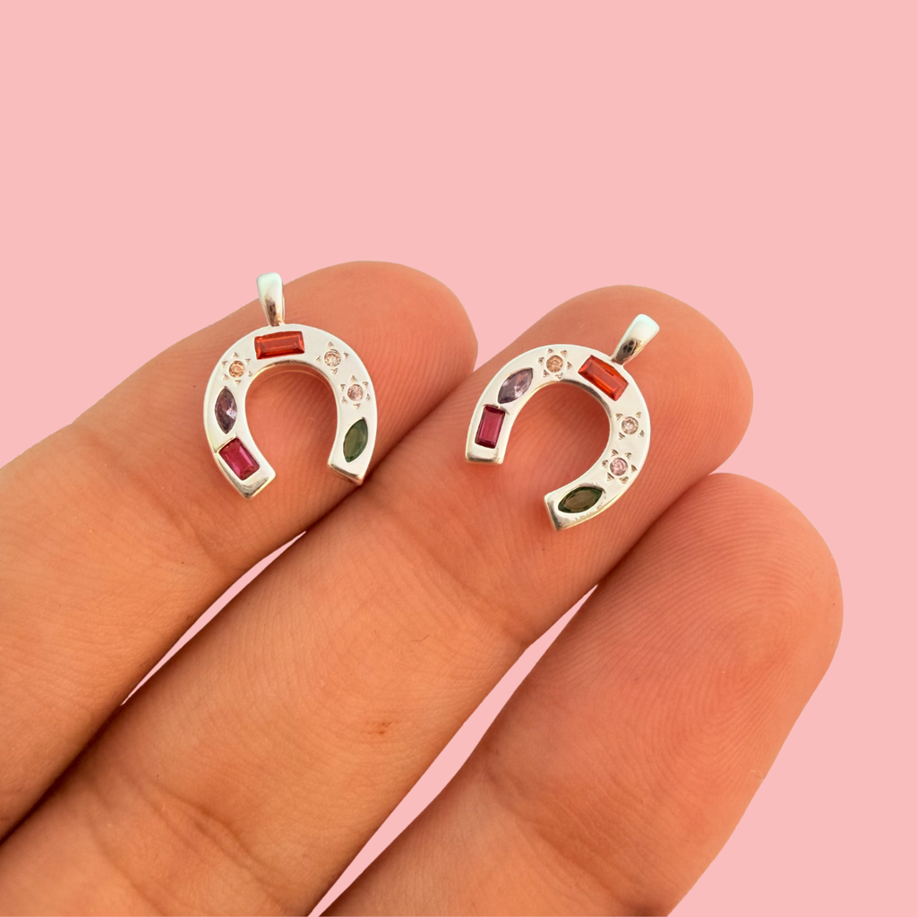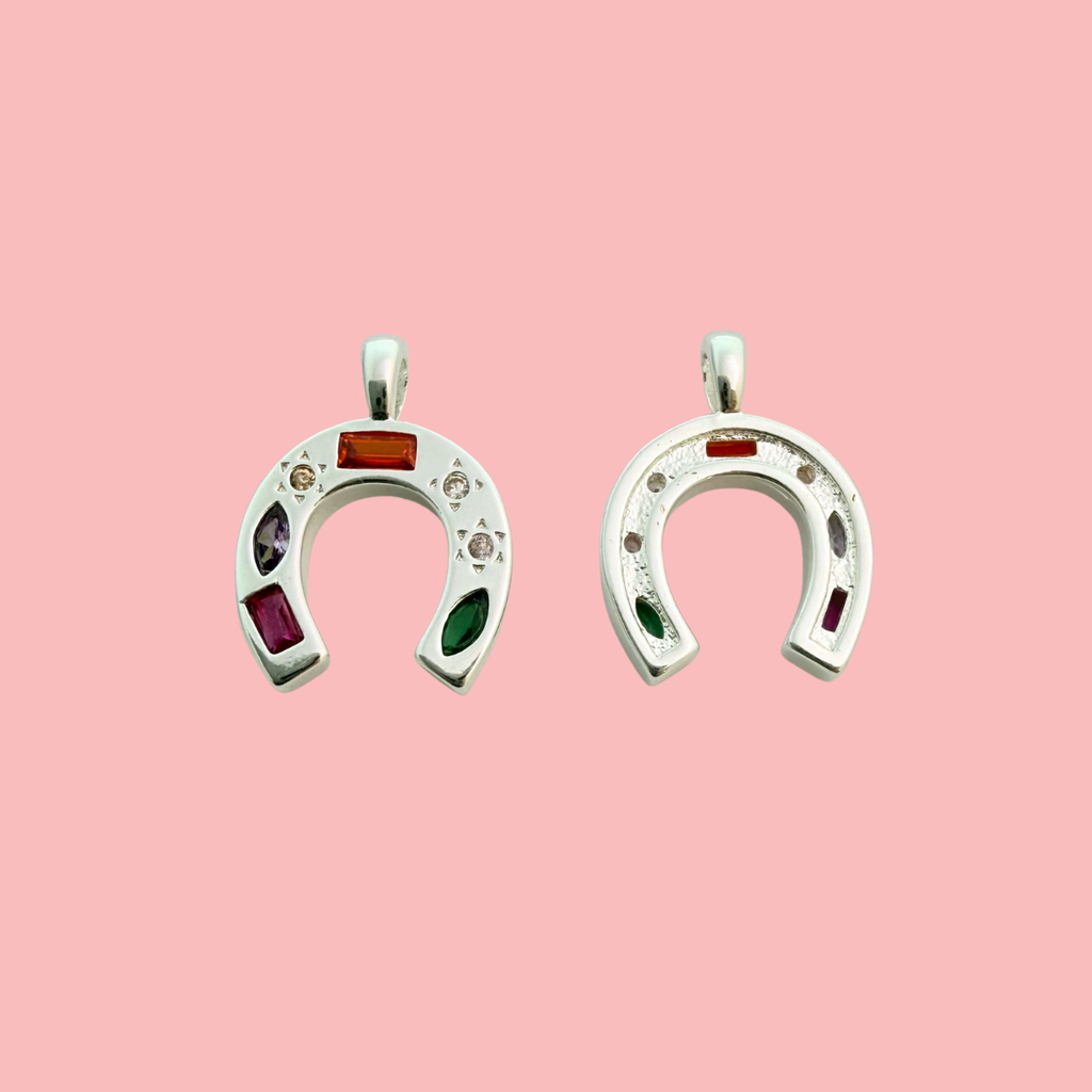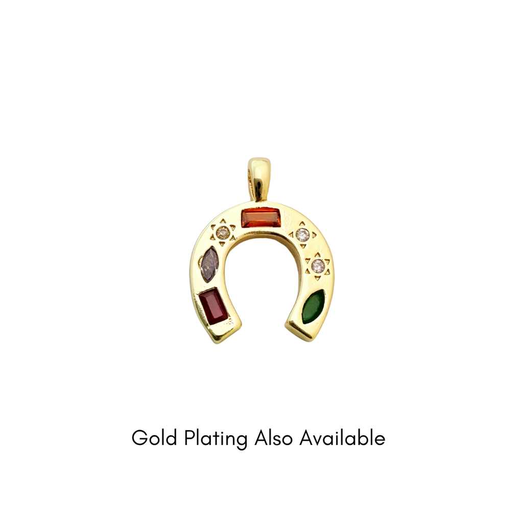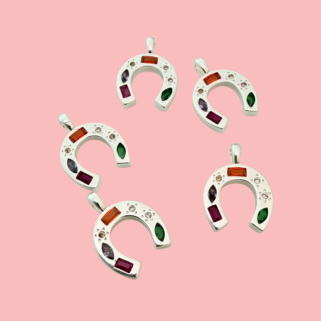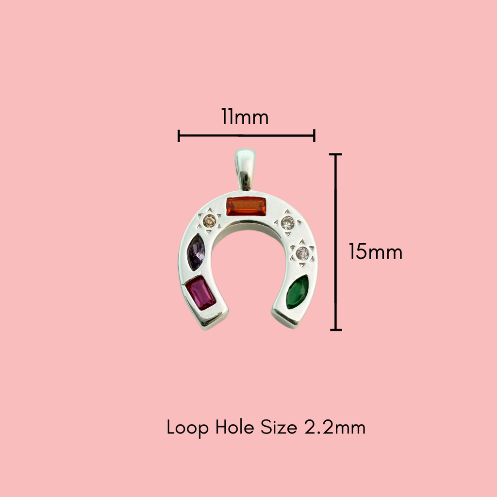 Bring charm and colour to your designs with this elegant silver-plated horseshoe pendant, a timeless symbol of luck and protection. Adorned with multi-shaped, vibrant cubic zirconia gemstones, it captures light beautifully from every angle. The smooth silver plating with a tarnish-resistant finish ensures lasting shine — a meaningful focal piece for unique, lucky-inspired jewellery creations.