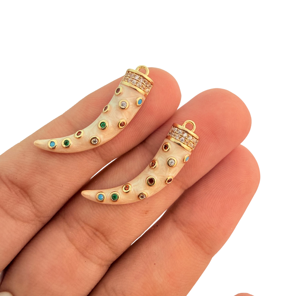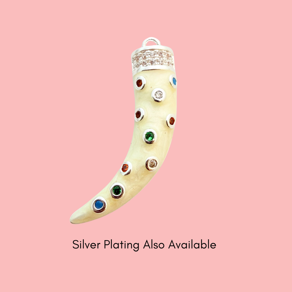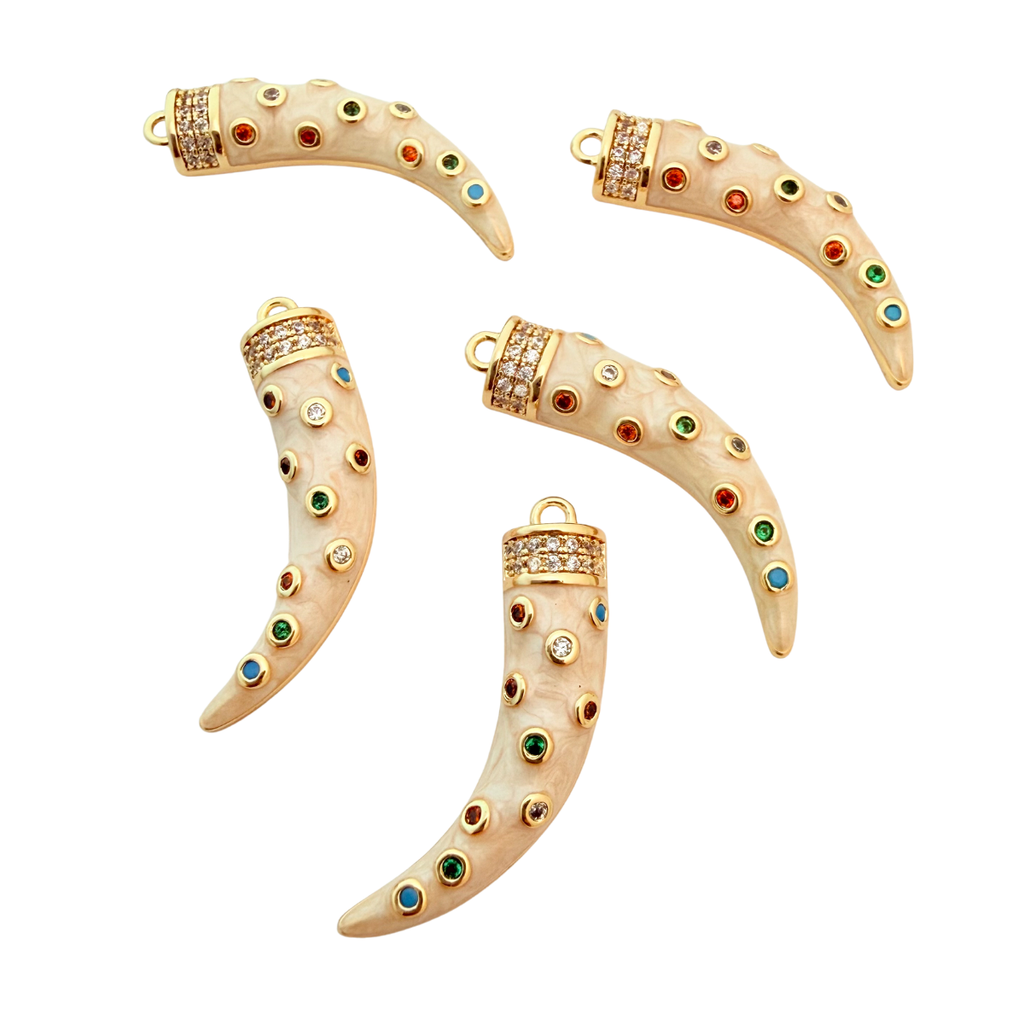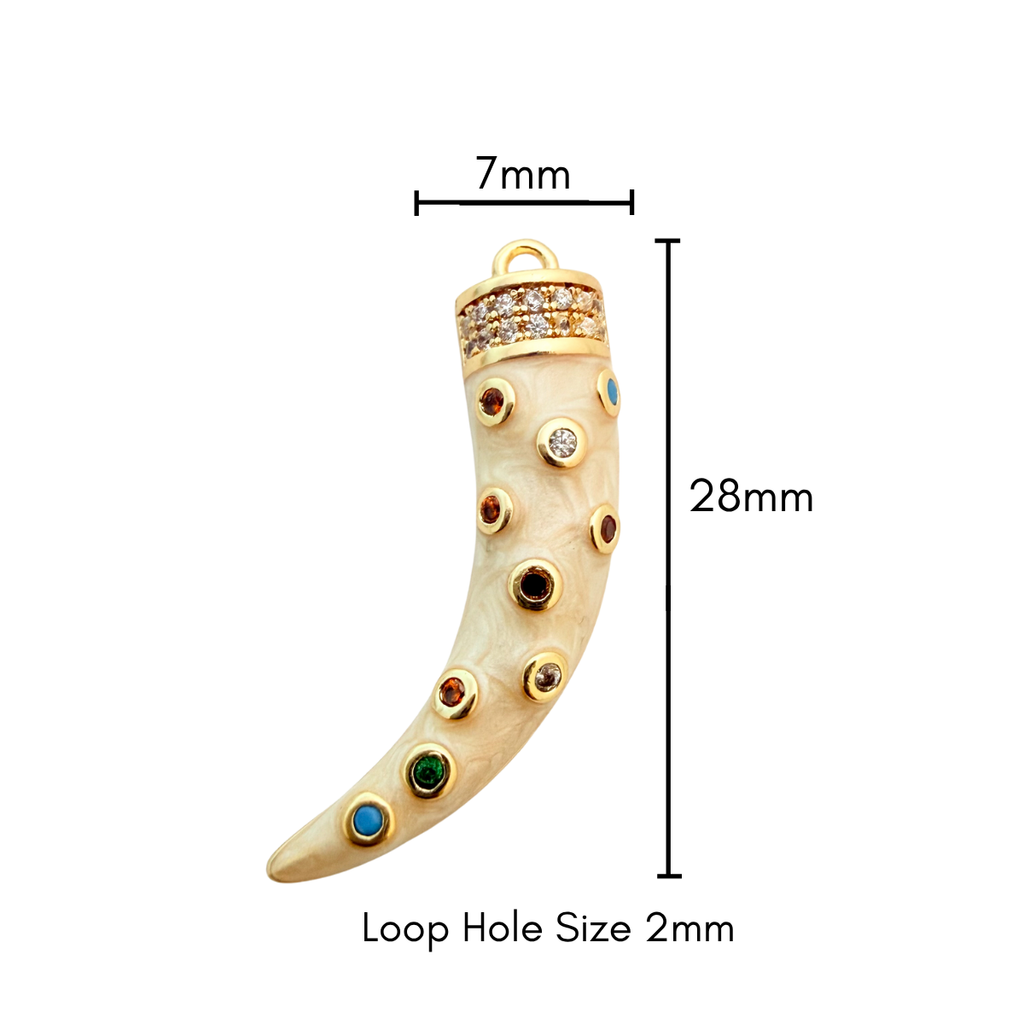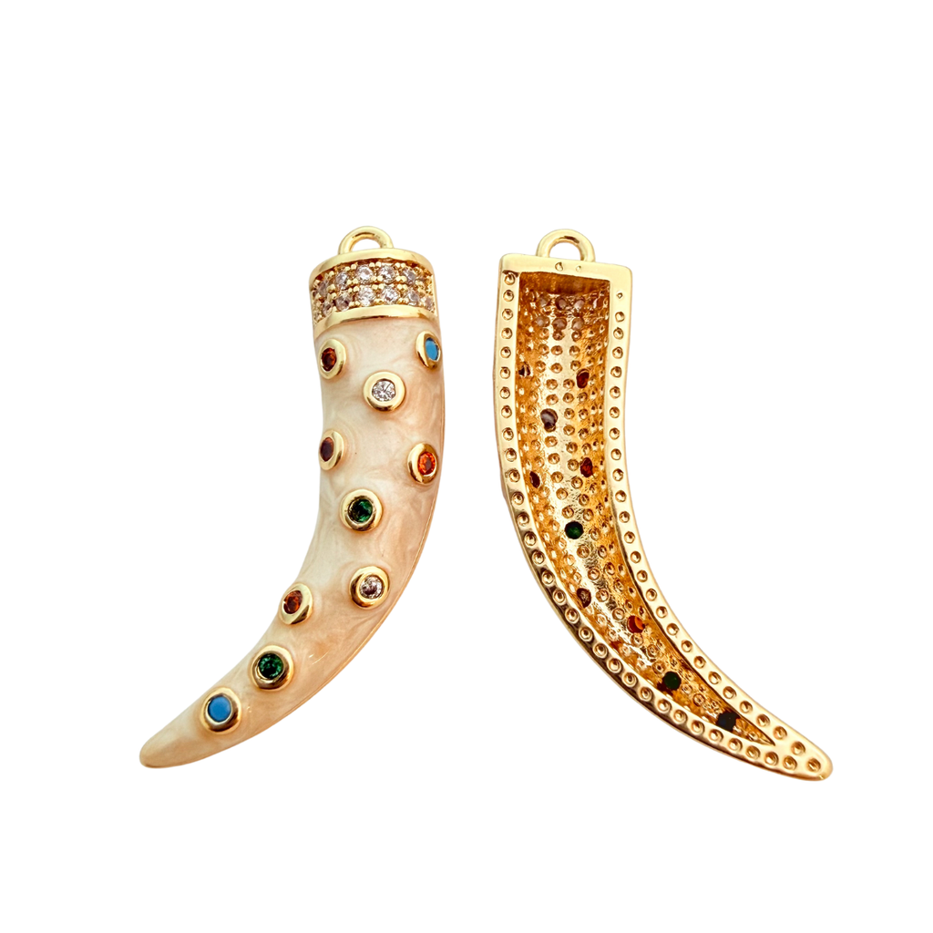 Bring a bold, bohemian touch to your designs with this striking gold-plated tusk pendant, adorned with multi-coloured cubic zirconia gemstones. Each stone is hand-set into a creamy ivory-toned base, creating a vibrant, textured finish that catches the light beautifully. The warm gold plating with a tarnish-resistant coating adds lasting radiance, making it a stunning centrepiece for statement necklaces or charm layering projects.