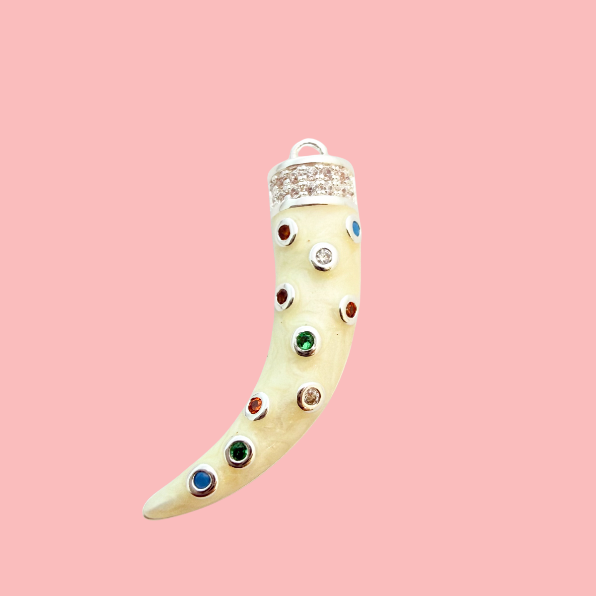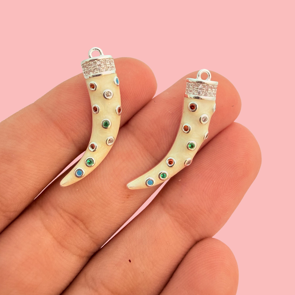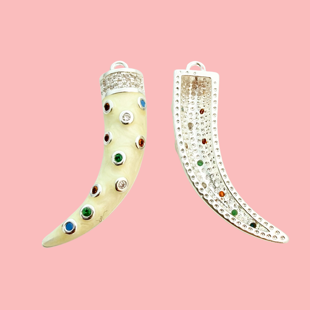 Add a bold, mystical touch to your jewellery designs with this Gemstone CZ Tusk Pendant. Inspired by ancient amulets of protection and strength, this statement charm features a swirling cream enamel body adorned with multicoloured gemstones and a sparkling pavé cap for a luxurious finish.