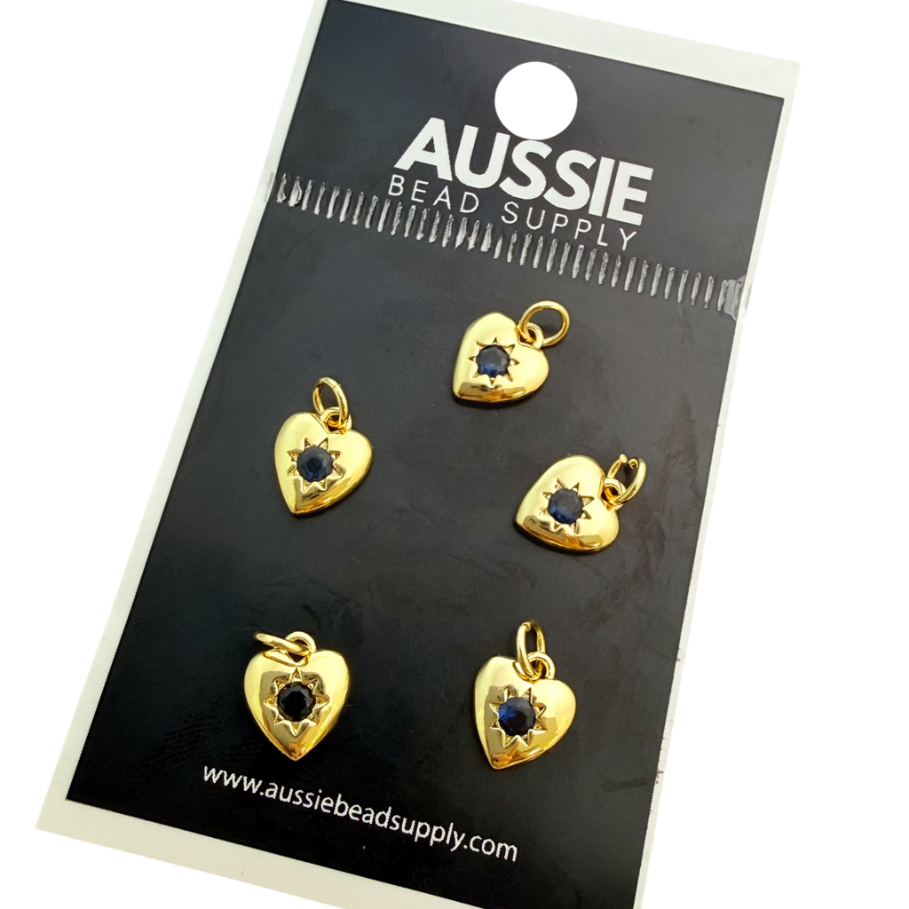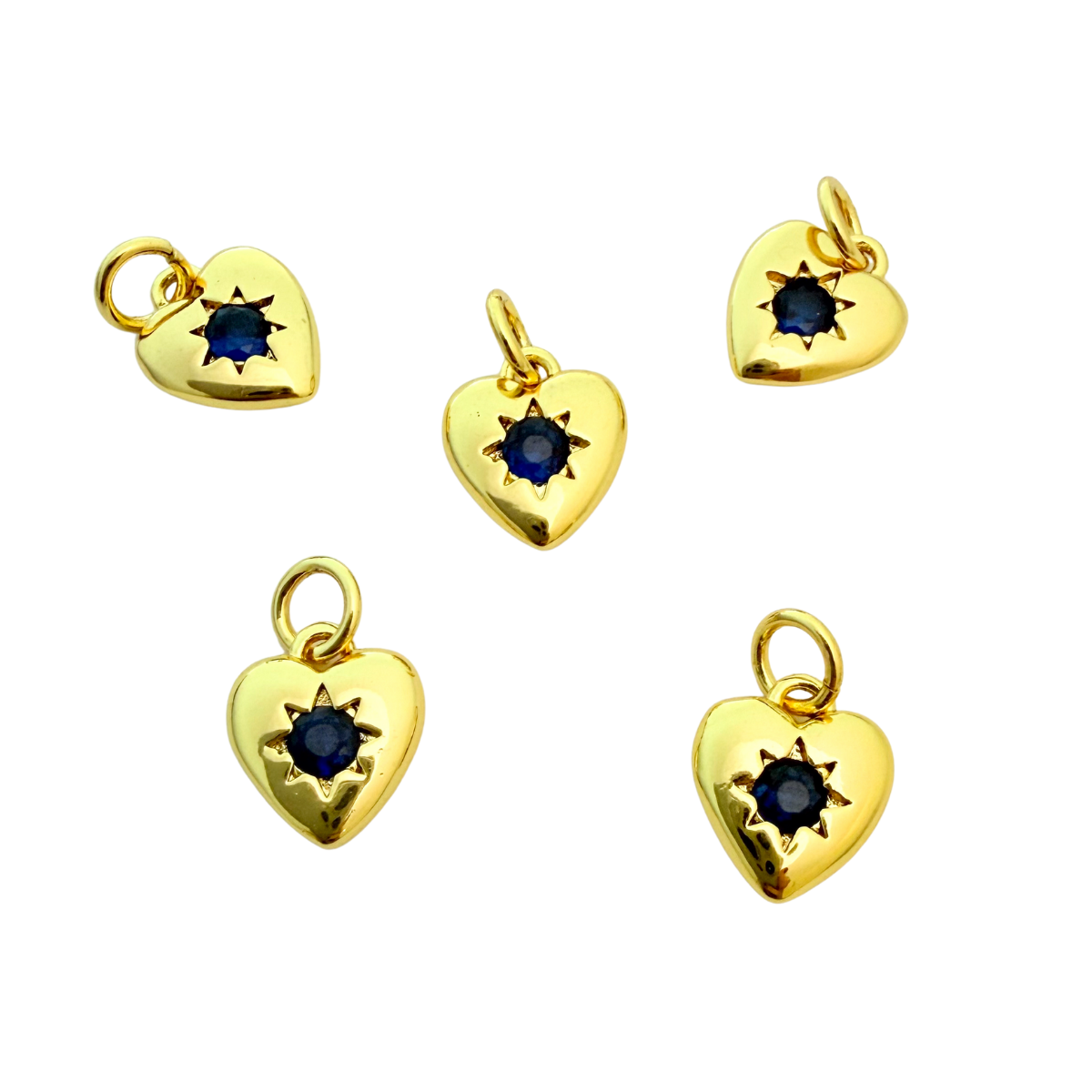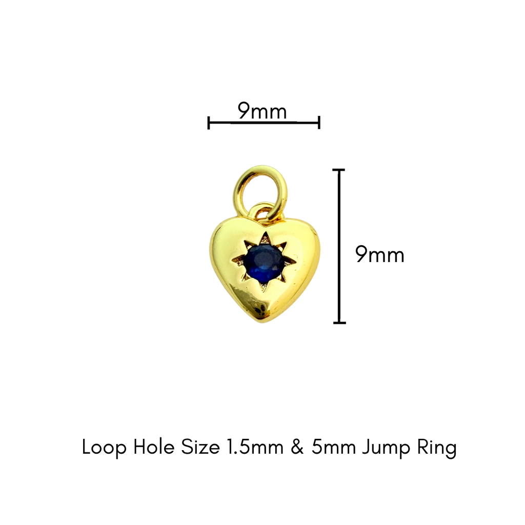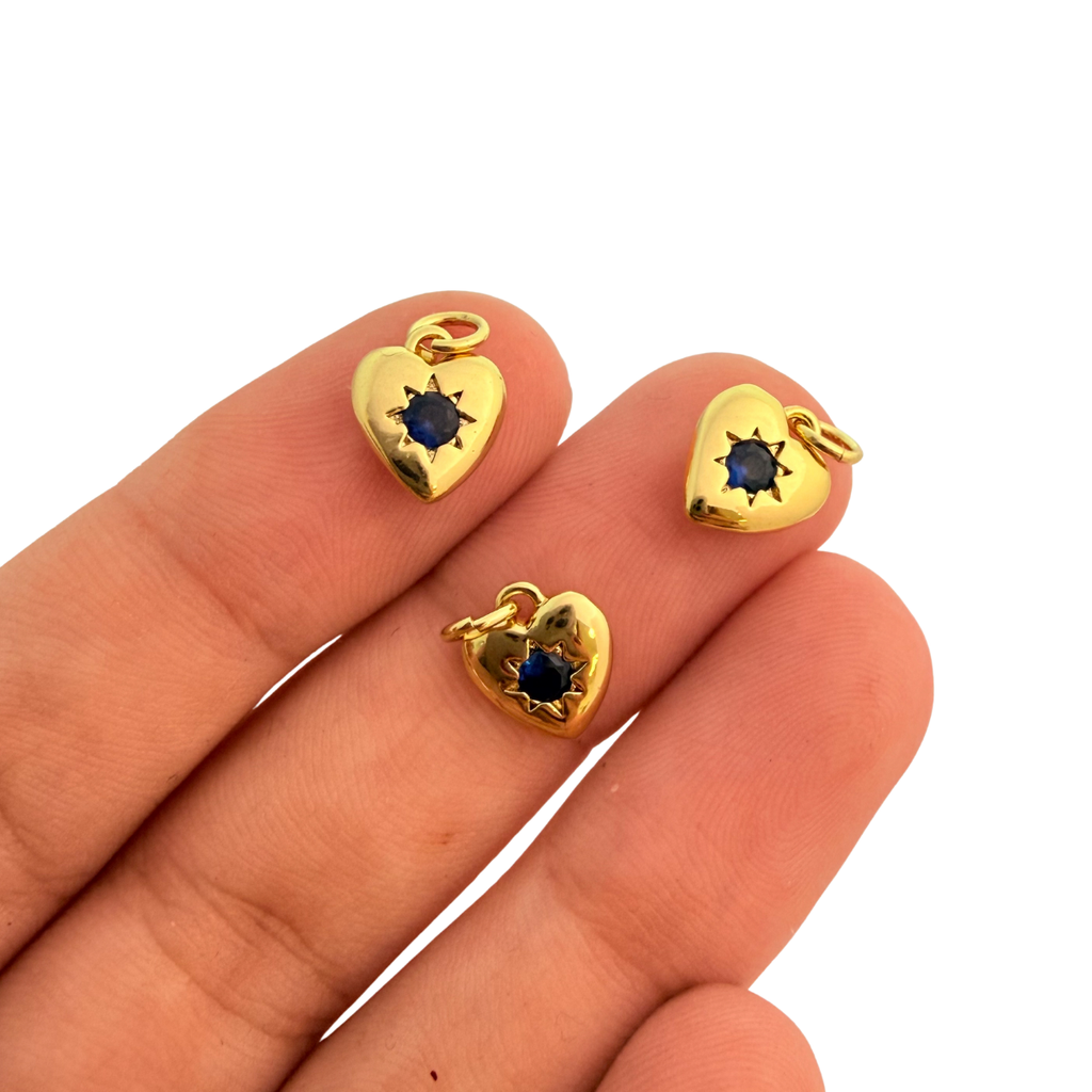 Add a spark of meaning and light to your creations with these delicate gold-plated heart charms, each featuring a deep sapphire-blue cubic zirconia nestled in a radiant starburst setting. Crafted with a lustrous, tarnish-resistant finish, they’re perfect for layering on charm bracelets, earrings, or fine necklaces — bringing a subtle touch of romance, wisdom, and protection to your designs.