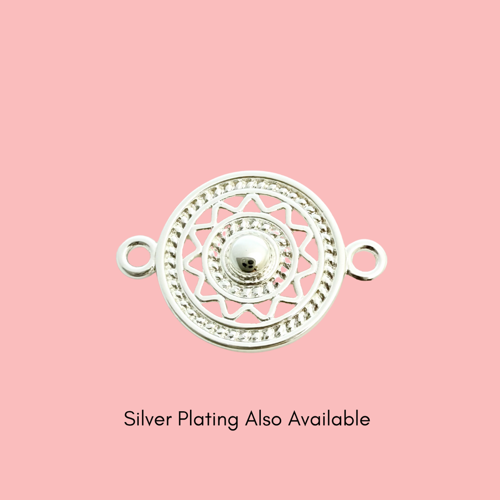 Enhance your jewellery designs with this Filigree Connector Charm. Featuring an intricate filigree design and a radiant gold-plated finish, this charm adds elegance and detail to any piece. The two loops make it perfect as a centrepiece, link, or accent in necklaces, earrings, and bracelets.