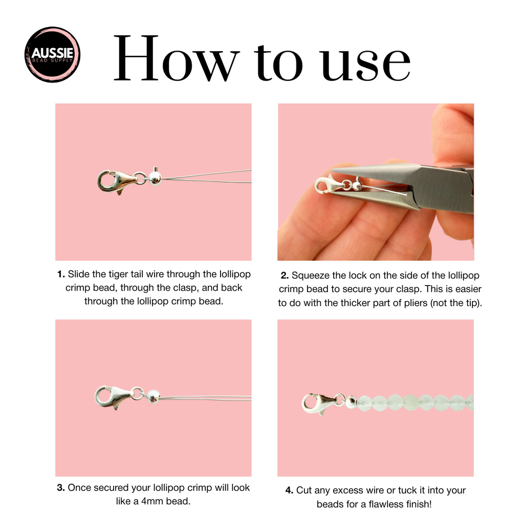 To crimp a lollipop bead, simply string it on and loop the beading wire back through to create a secure loop, making sure your beads are snug against the crimp. Then squeeze the crimp bead firmly with the notched second station of crimping pliers, and use the rounded first station to fold it in half. Alternatively, for some types of crimps, chain nose or flat nose pliers can be used to hold the crimp in place and gently squeeze it closed.
