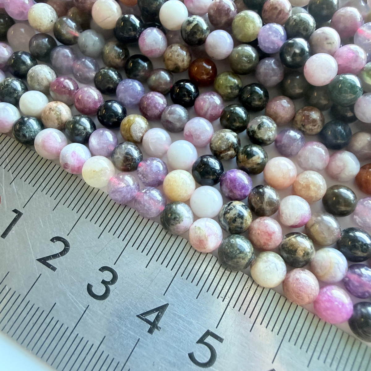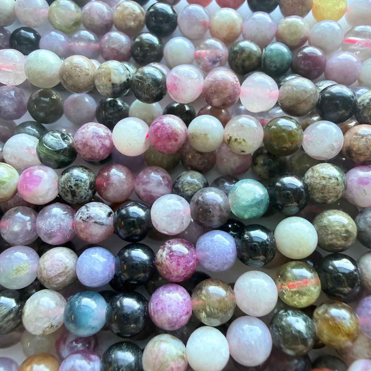 This Premium Tourmaline strand is a higher-grade selection than our regular range, chosen for its rich colour variation, improved clarity, and smooth, consistent polish. Each high-grade bead features a natural blend of greens, pinks, blacks, and earthy tones with a glossy round finish that adds depth to any design.