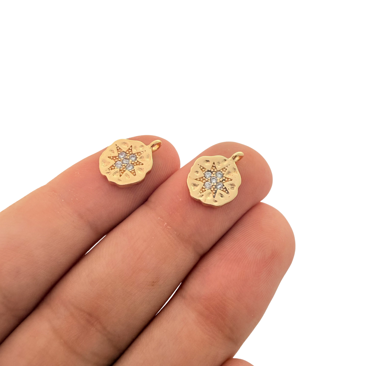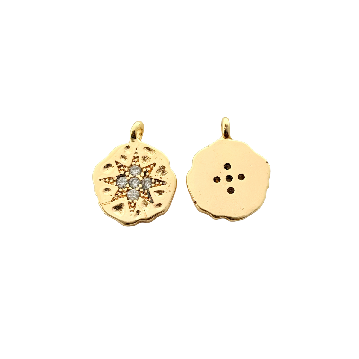 Radiating delicate sparkle, this round charm features a softly textured gold-plated surface with a raised starburst centre set with clear crystals. The contrast between the organic edge and the refined stone setting gives it a beautifully handcrafted feel, while the tarnish-resistant finish helps maintain its warm glow.