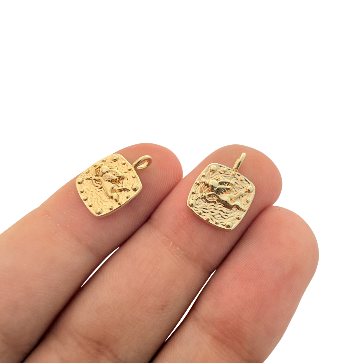 Playful yet refined, this square charm features a raised cupid motif set against a softly textured background with delicate beaded edging. The polished gold-plated finish highlights the sculpted details, while the tarnish-resistant coating helps preserve its rich shine.