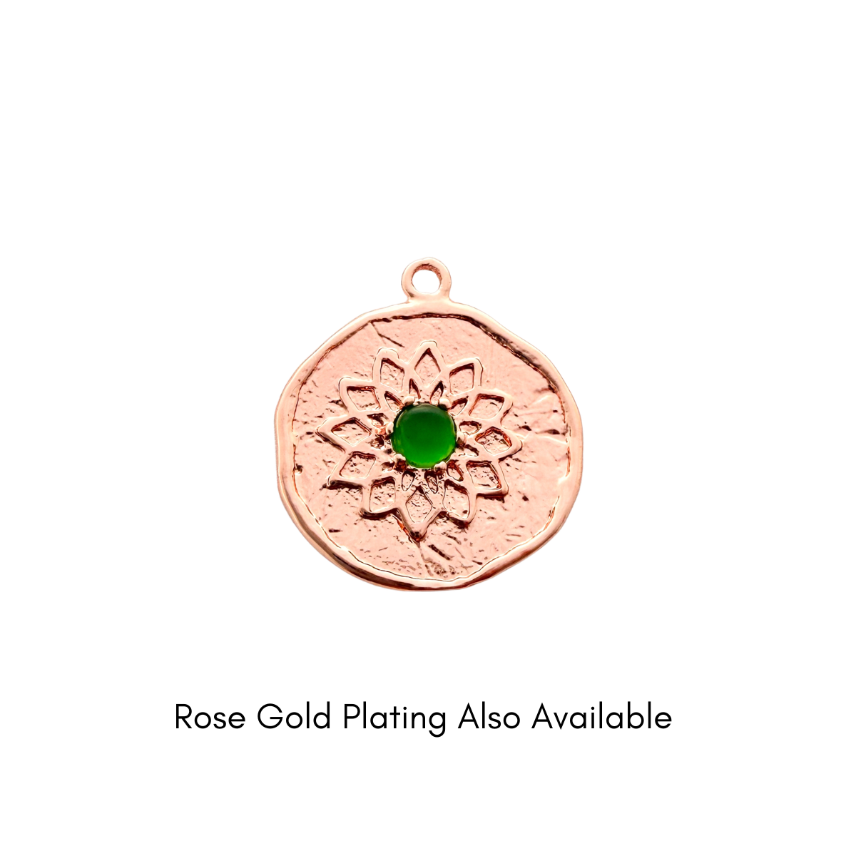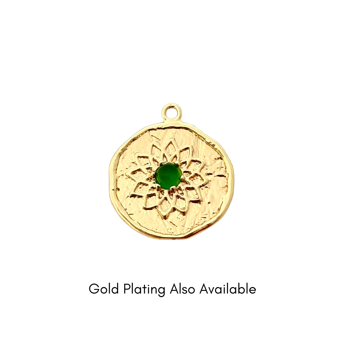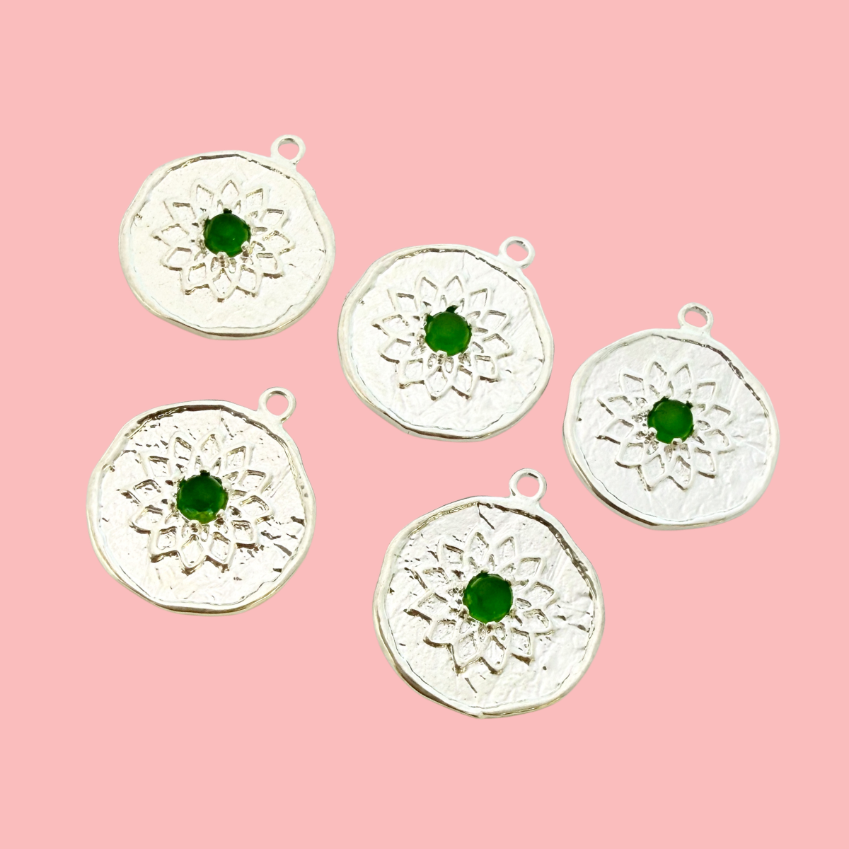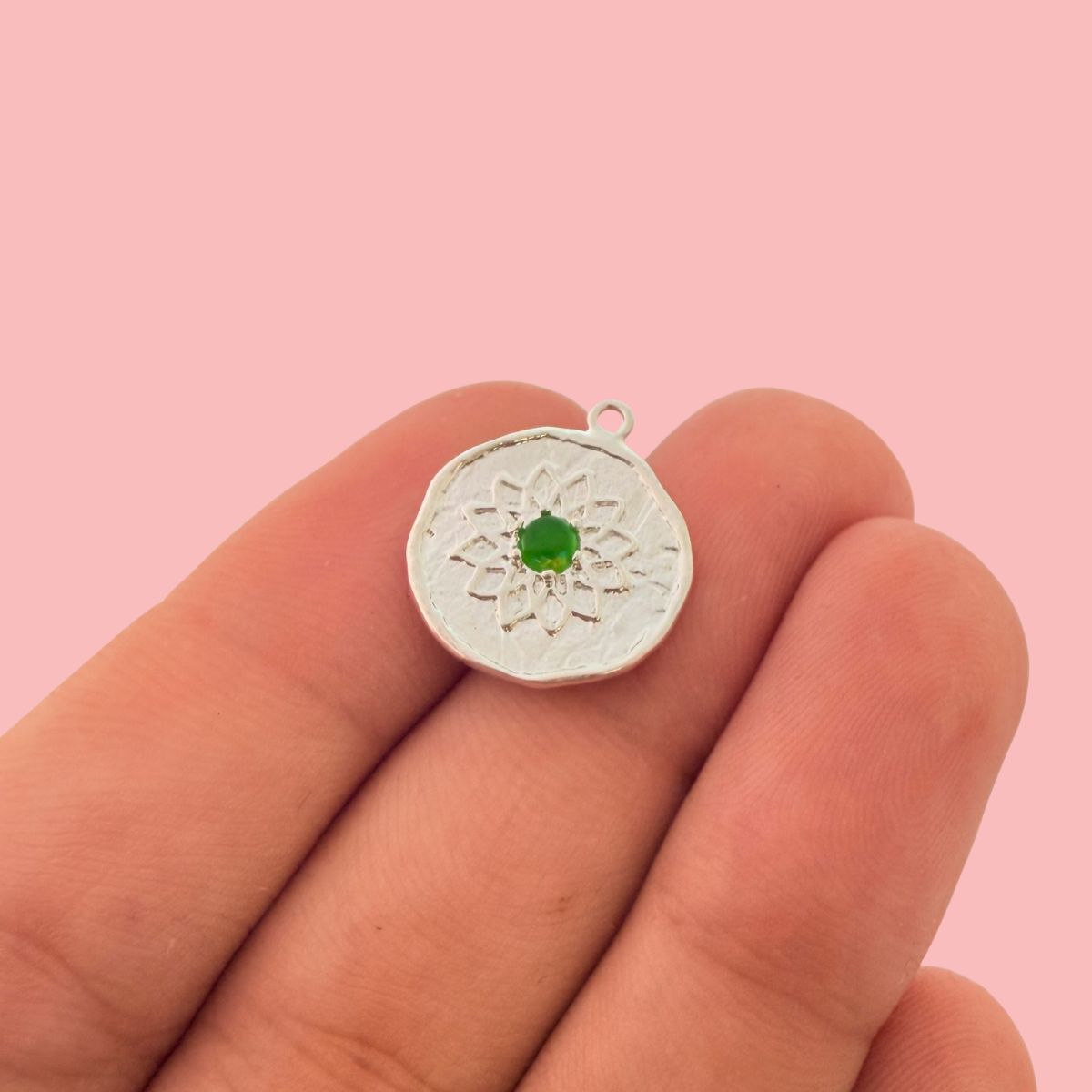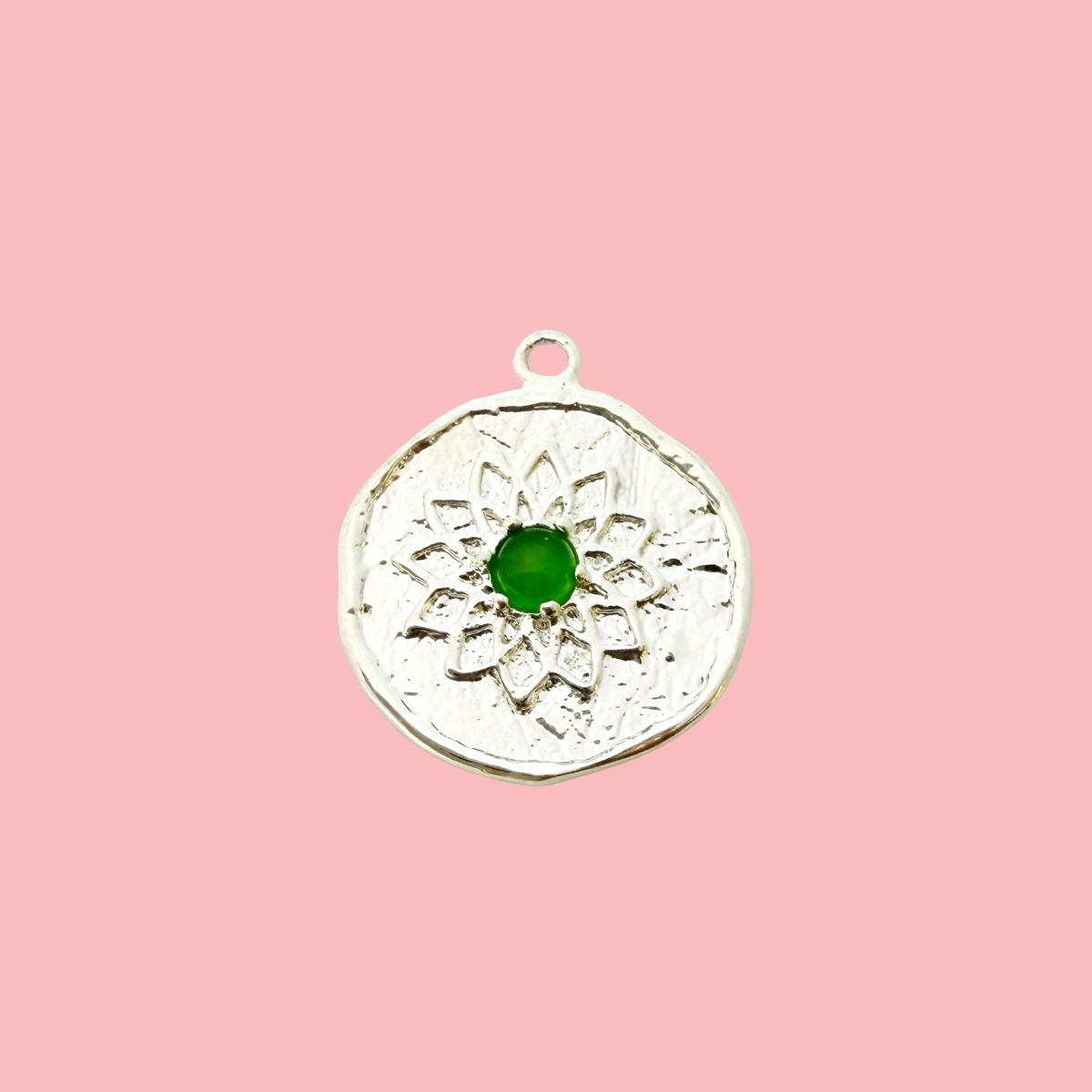 Refined and symbolic, this round charm features a softly textured silver-plated surface with a detailed lotus flower design, centred by a rich green stone. The raised lotus petals add depth and meaning, while the organic edge gives it a handcrafted feel.