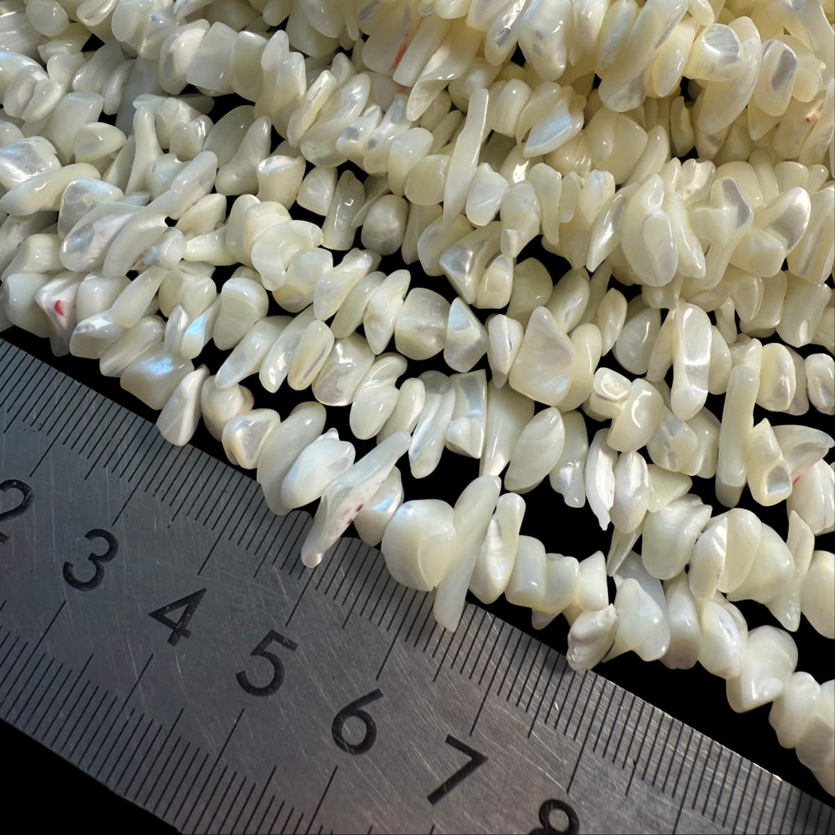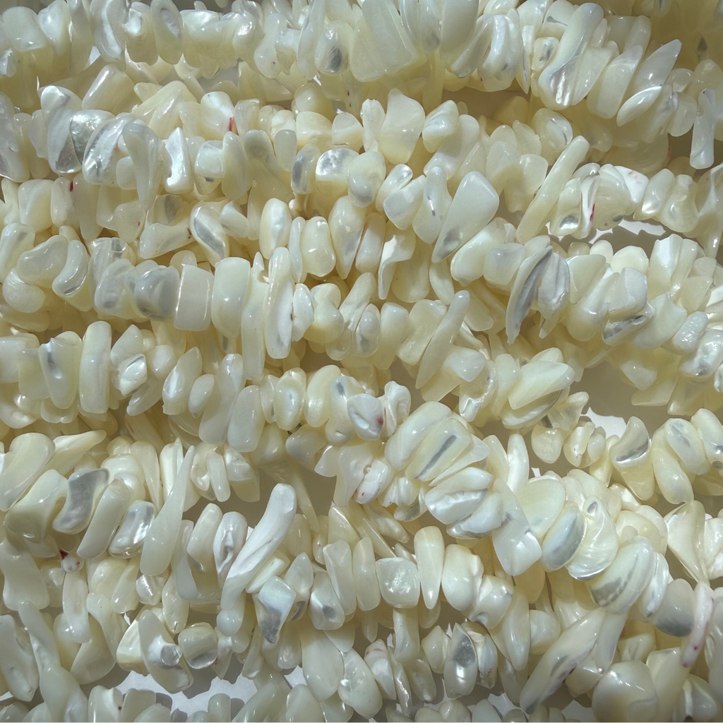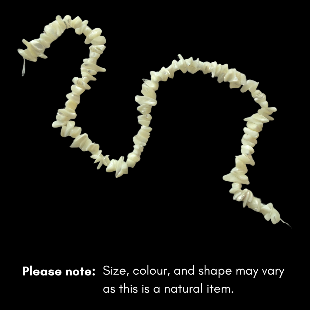 These Mother of Pearl Chip Beads shimmer with soft iridescence, capturing the natural beauty of the ocean. Each bead is organically shaped, adding unique texture and depth to your designs. Perfect for ocean-inspired jewellery, layering necklaces, or bohemian bracelets. Their pearly glow complements both gold and silver accents beautifully. Natural variations occur, making every strand one of a kind.