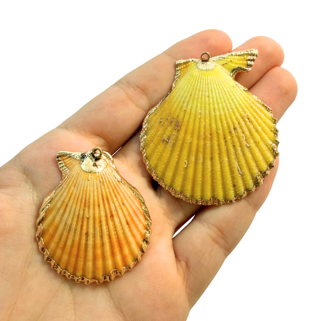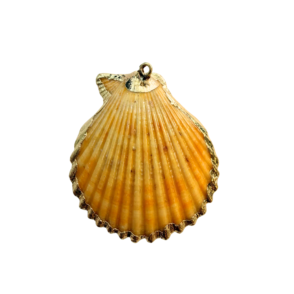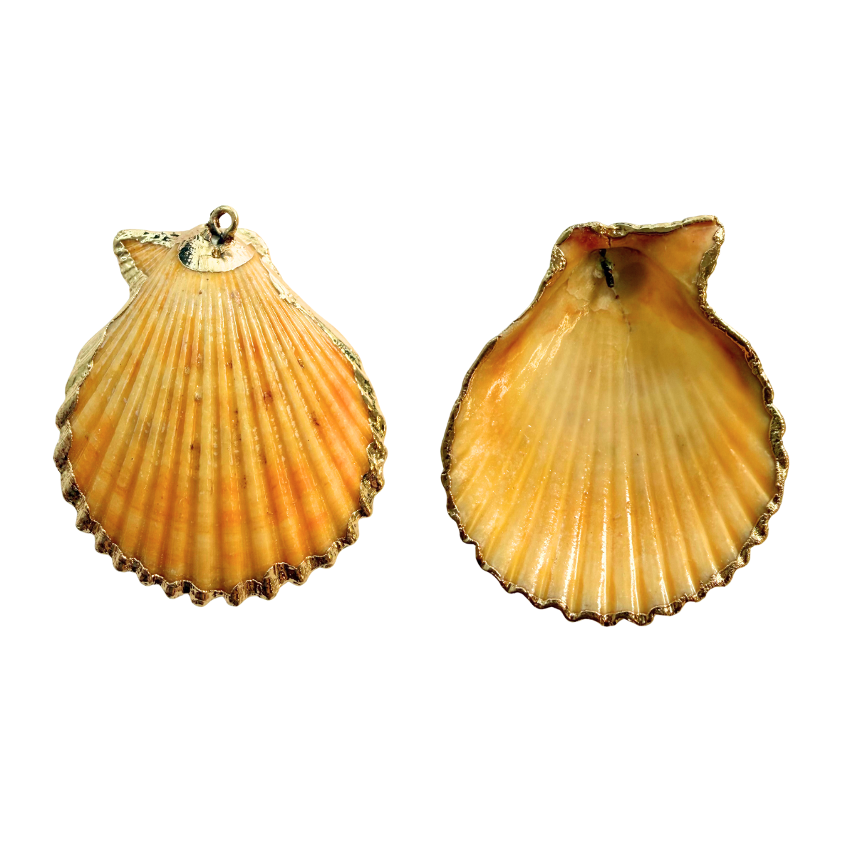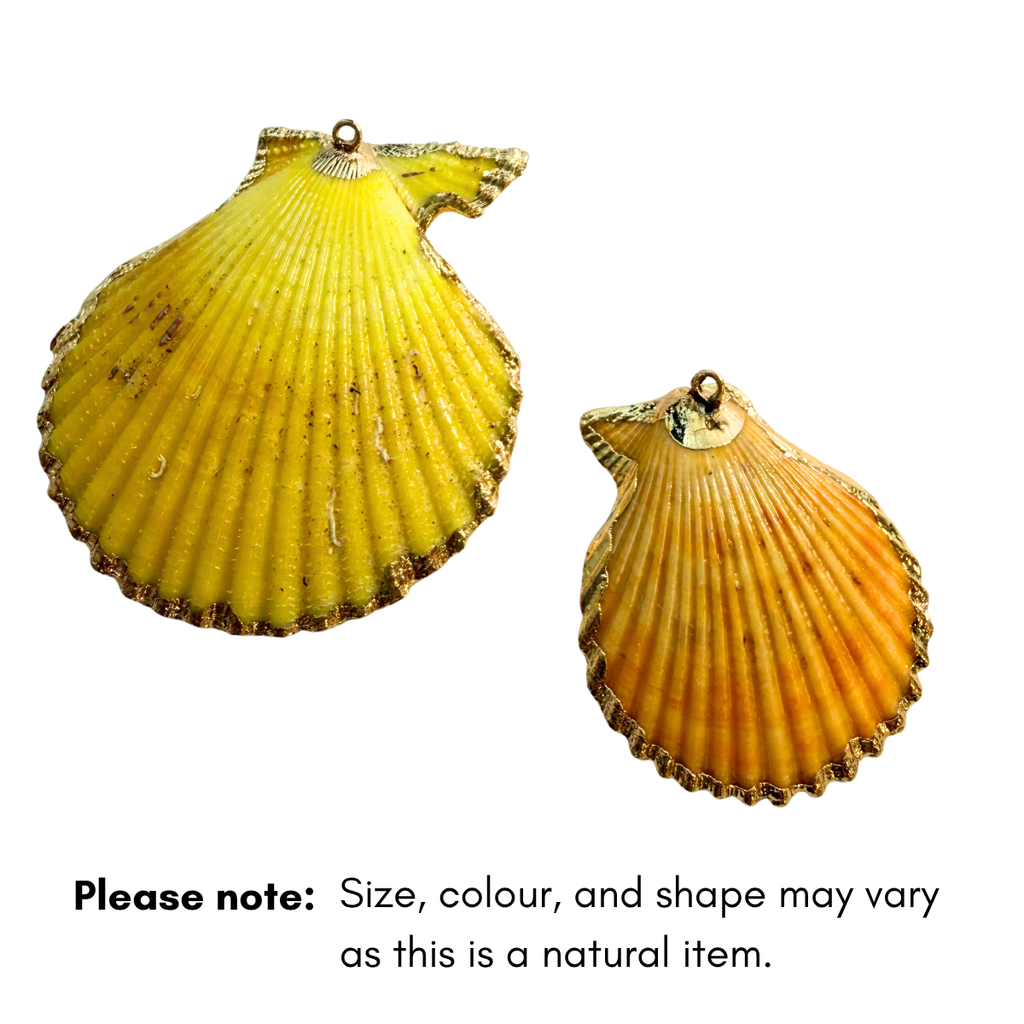 Bring a touch of sunshine to your designs with this natural yellow scallop shell pendant, beautifully edged in gold plating. Each shell is completely unique, showcasing its own variations in colour, pattern, and texture — a true gift from the sea. The golden trim highlights its organic beauty, making it perfect for statement necklaces, earrings, or one-of-a-kind coastal creations.