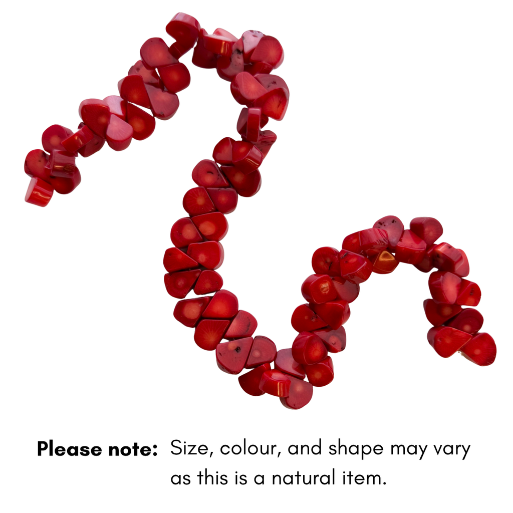 These Large Dyed Red Coral Oval Beads feature bold, organic shapes and a striking deep red tone — perfect for statement pieces. Each sustainably farmed coral bead is polished smooth, highlighting its natural grain and rich colour. Ideal for creating ocean-inspired jewellery or adding vibrant contrast to neutral designs. Natural variations in tone and shape make every strand truly one of a kind.